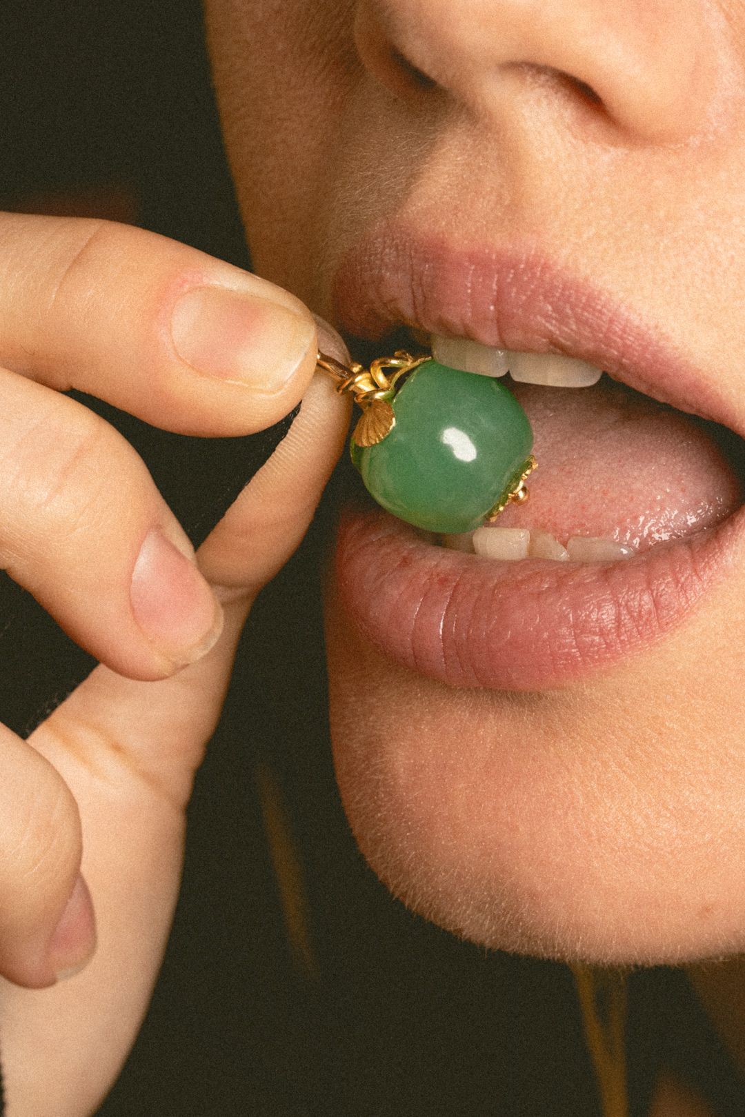 Ce bijou est une pièce unique. La pomme est une belle chysoprase de 24,25 carats décorée de feuillage en or jaune 18 carats.